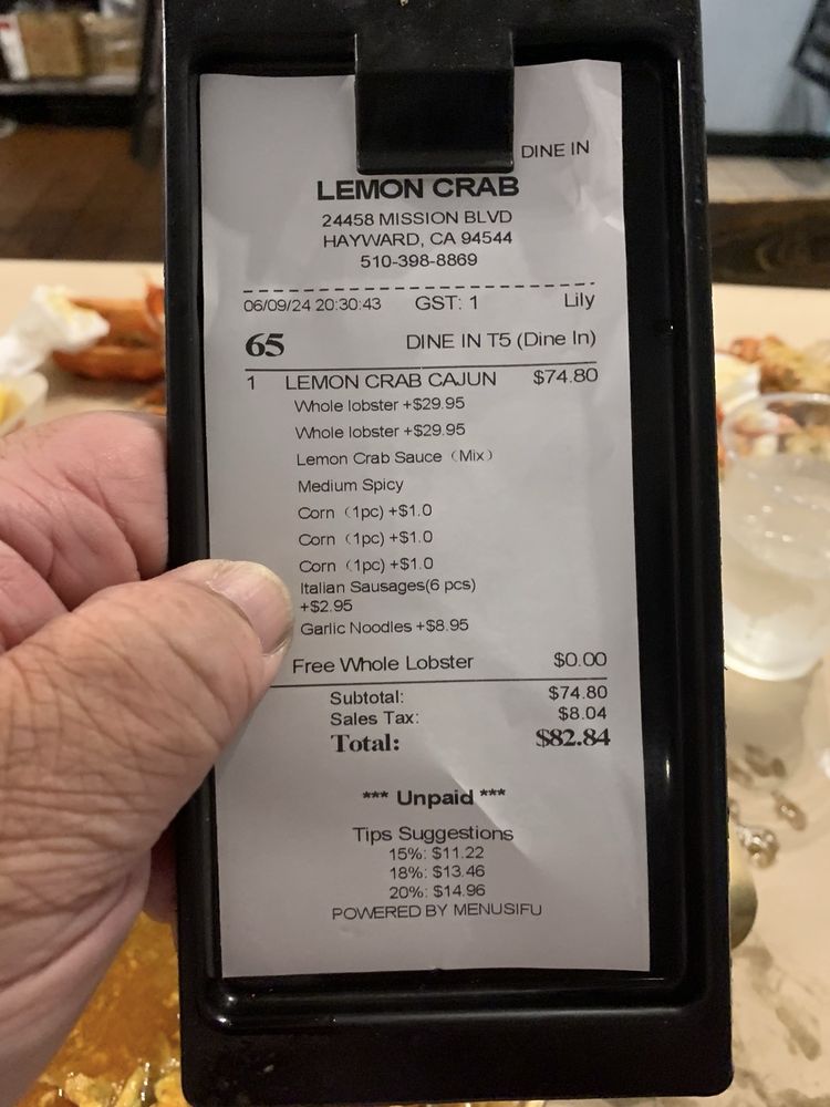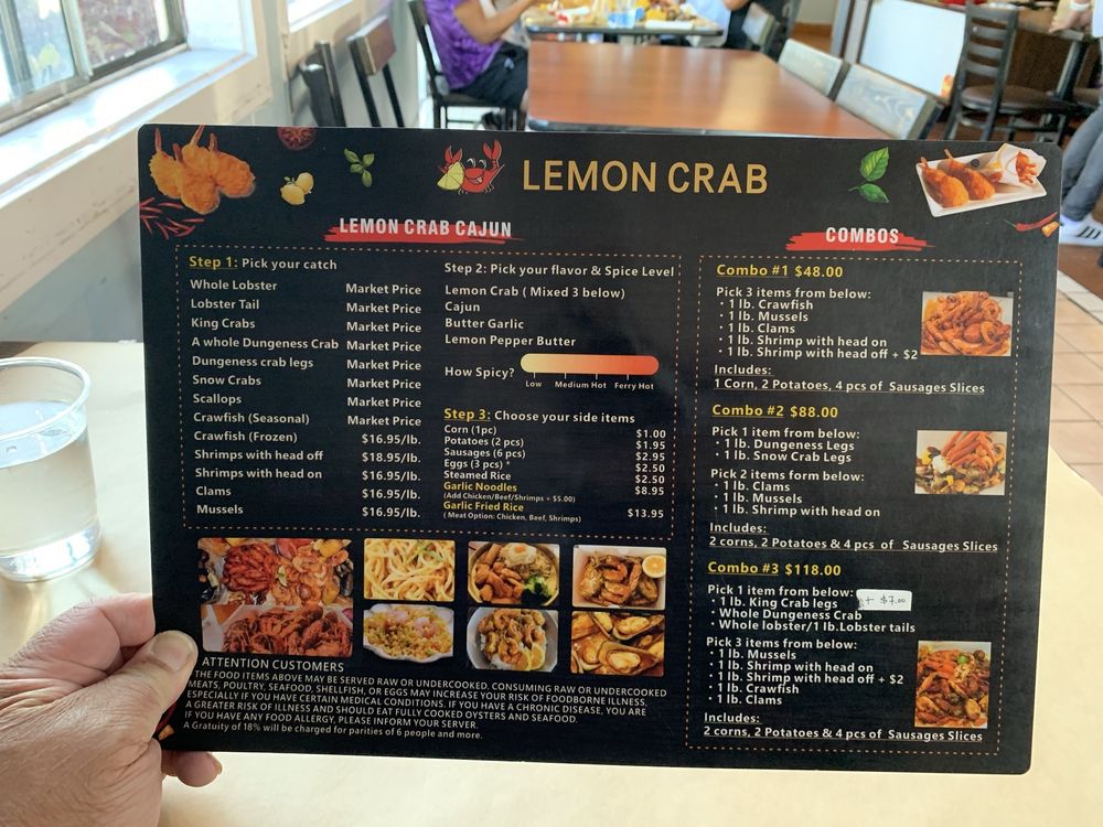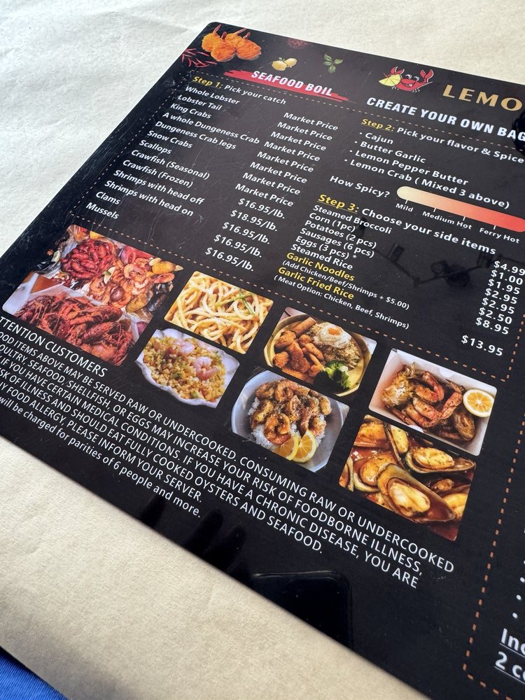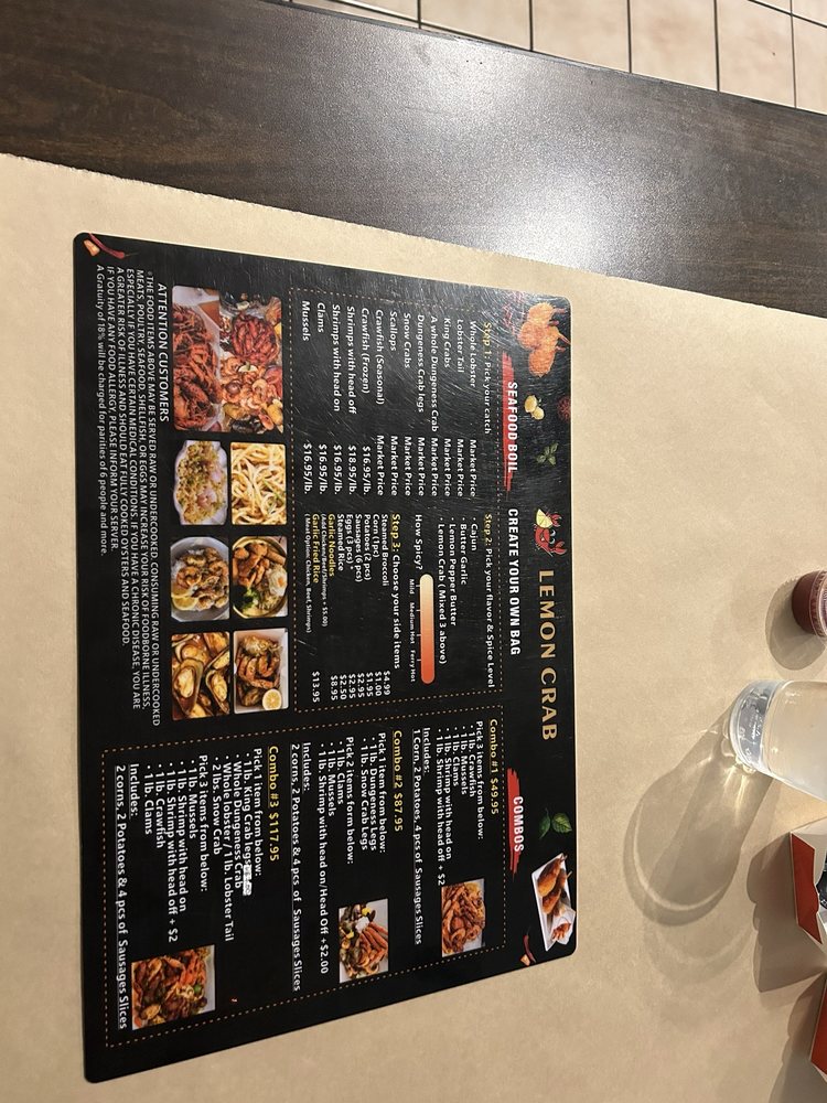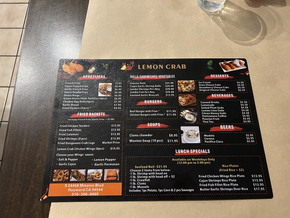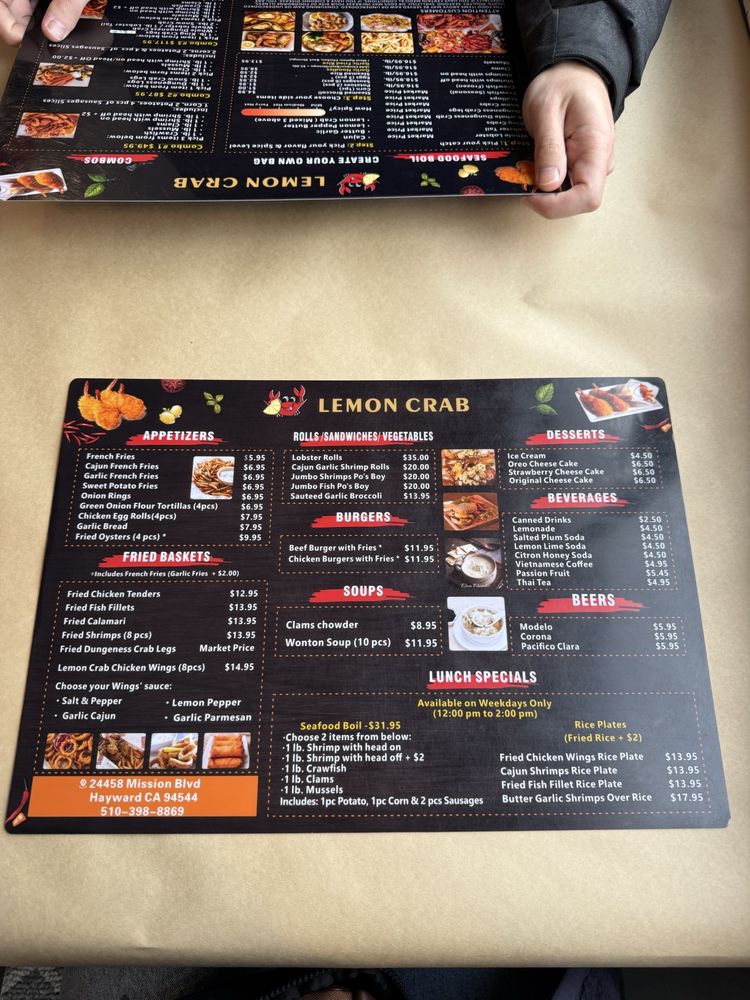 Welcome to Lemon Crab, a Cajun/Creole seafood restaurant located in Hayward, CA. Lemon Crab offers a unique dining experience with a variety of seafood boils, combos, and add-ons to choose from. Their menu includes fresh seafood options such as clams, crawfish, Dungeness crab, king crab, lobster tails, mussels, scallops, and shrimp prepared to perfection. With options like combo meals that feature a mix of different seafood choices, Lemon Crab ensures that there is something for everyone to enjoy. The restaurant also provides add-ons like corn, sausage slices, eggs, garlic noodles, potatoes, and steamed rice to complement your meal. Enjoy the casual and trendy ambiance with outdoor seating and dog-friendly options while savoring delicious seafood dishes at Lemon Crab. Whether you are dining in or taking out, Lemon Crab is the perfect spot for a seafood feast.